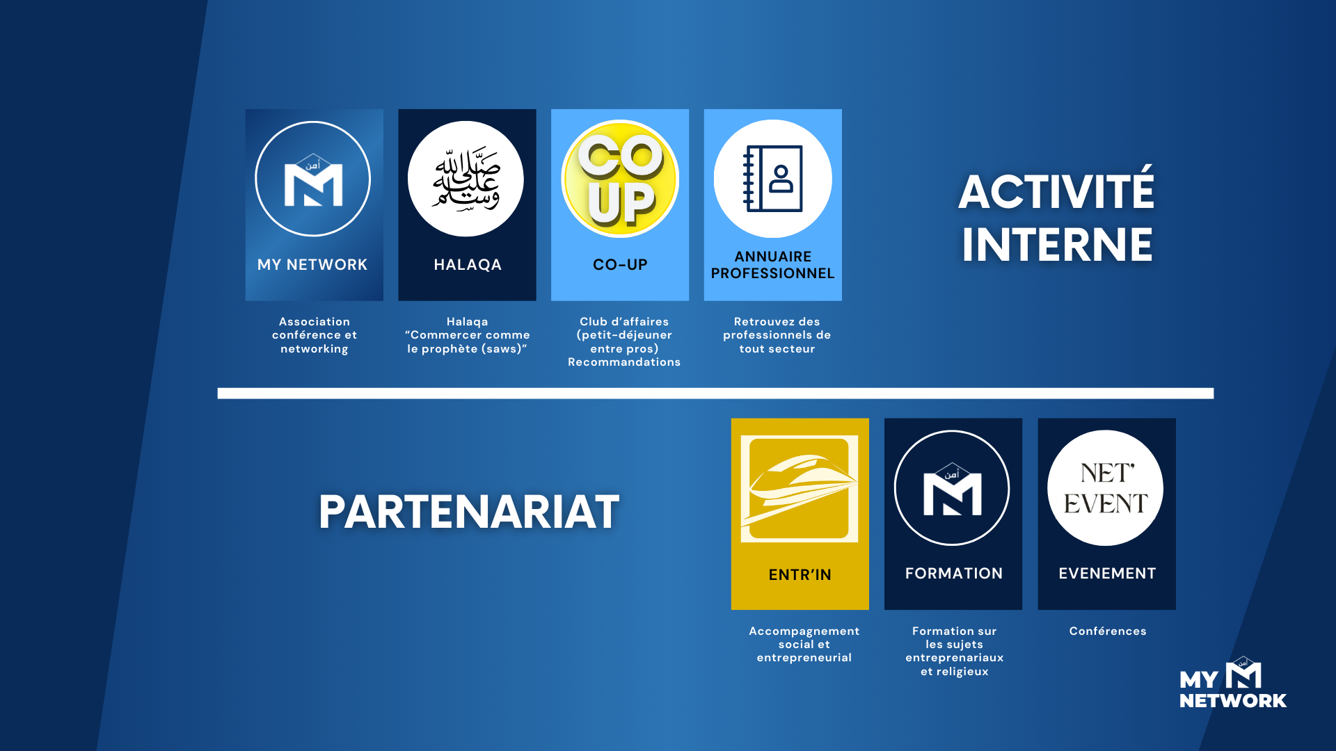 MY NETWORK, c’est bien plus qu’un réseau professionnel. C’est une communauté de musulmans qui partagent des valeurs fortes : l’entraide, la bienveillance et l’excellence. Nous croyons que l’entrepreneuriat et le monde professionnel peuvent être des leviers puissants pour renforcer nos liens et transmettre nos valeurs.